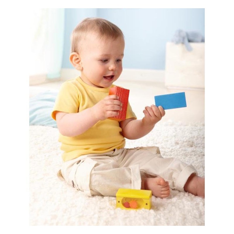 Colored blocks with integrated patience games; use a building blocks initially; later use in a way to balance the discs and balls contained withing the blocks