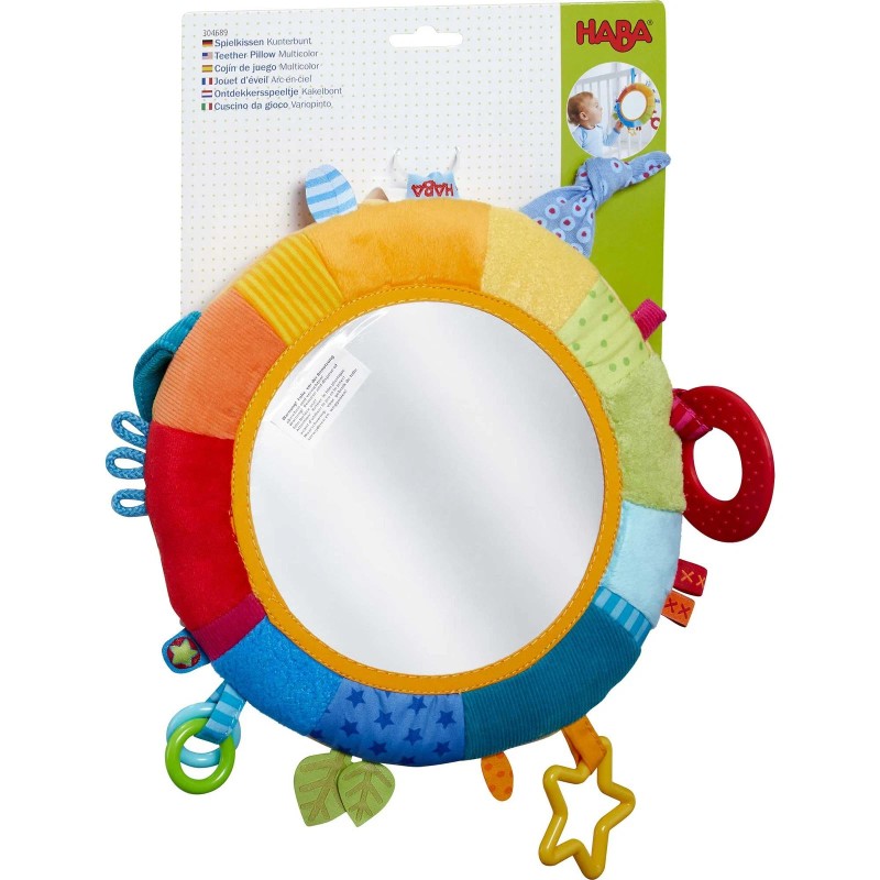 - VIBRANT COLORS & TEXTURES: The HABA Rainbow Mirror features bright colors, soft textures & 11 sensory elements, including a crinkly knot & teething ring for engaging tummy time exploration.