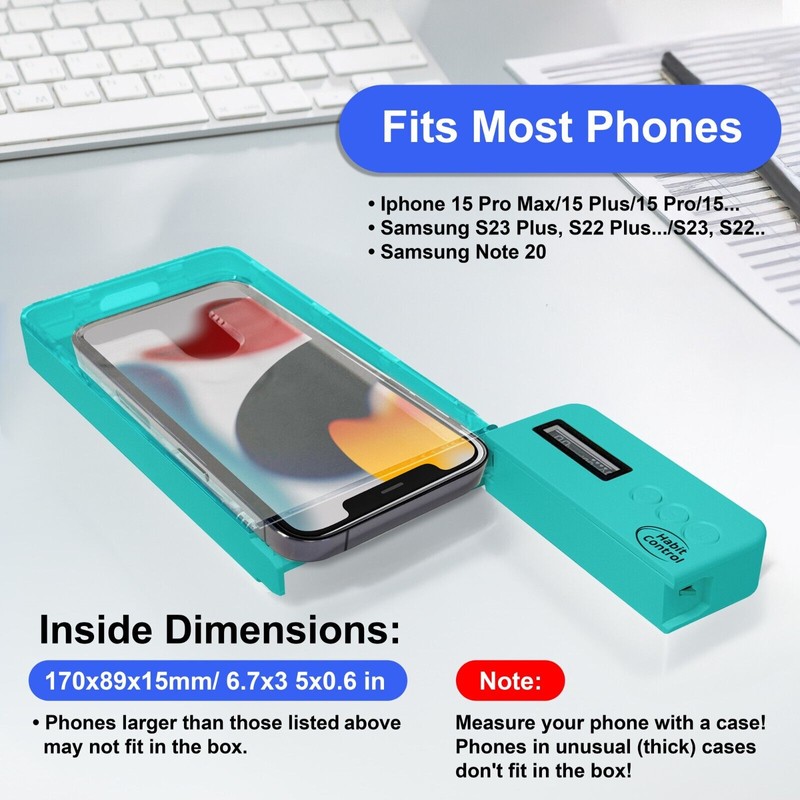 - Compatible with Most Smartphones: Habit Control phone timer lock box works with a wide range of devices, including iPhone models 16/16 Pro/16 Pro Max, 14/14 Pro/14 Pro Max, 13/13 Pro/13 Pro Max, 12, 11, X, XR, XS, 8, 7, 6 Plus, as well as Samsung, Motorola, Huawei, and more. The internal dimensions are 170x89x15mm (6.7x3.5x0.6in). Note: Designed to fit phones with slim, compact cases.