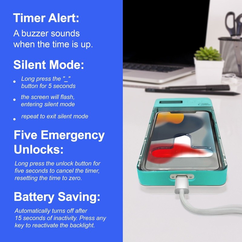 - Extended Standby Time: Cellphone lock box features a timer that can be set for up to 99 hours, with a standby duration of up to 30 days, ensuring long-lasting performance between uses.