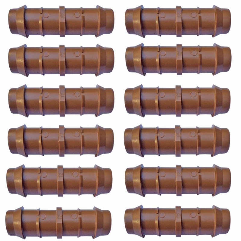 Easily repair or expand your drip irrigation system with twelve drip couplers that connect two pieces of half-inch drip irrigation tubing together. Keep these barb connectors on hand for quick sprinkler hose repair, irrigation tubing dripline repair, or to expand or extend your drip system. Use these irrigation tubing connector joints with other 1/2 drip irrigation fittings like 90 degree elbow corners, tees, and irrigation line end caps to connect and configure your irrigation system exactly how you want it.
