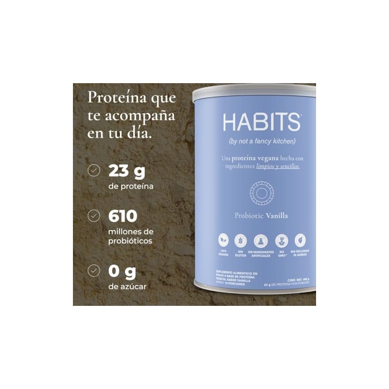 HABITS BY NOT A FANCY KITCHEN | Proteína Vegetal en Polvo | Sabor Vainilla 488 g | 21.5 g de Proteína Por Porción | Sin Azúcares Añadidos | Fuente de BCAAs, No GMO 16 Porciones