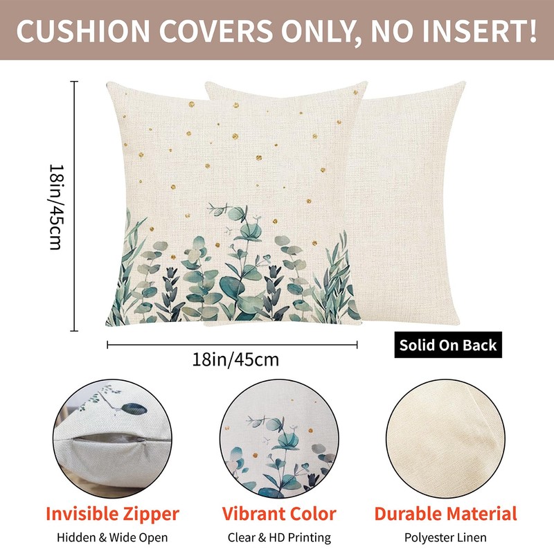 - Design: The decorative cushion & covers with eucalyptus leaves in watercolour are printed on one side (the back is beige and without pattern). The elegant green leaf pattern is perfect for decorating home, living room, garden, sofa, couch, armchair and car. Suitable for spring and summer. Also a great gift for friends and family.