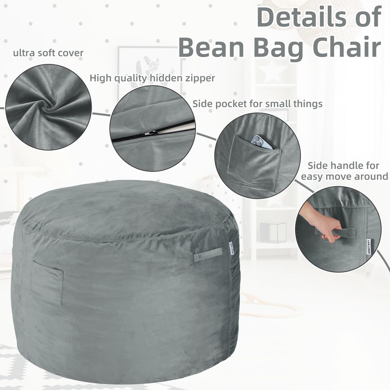 - CONVENIENT DESIGN - For easy mobility, our bean bag chairs are designed with a handle, so you can move it where you want. There is a medium-sized pocket on the side of a comfy chair, you can store your mobile phones, remote control, books, and some small items.