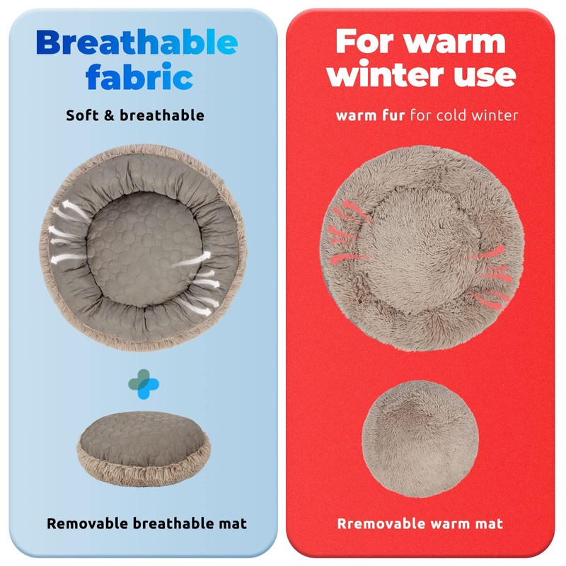 - NO MORE HOT: HACHIKITTY donut dog bed is made of cooling fabric, keep your dog cool in this summer, no more hot! Double-sided usable design with thickened warm fluff on one side and smooth polyester on the other. You can choose the suitable side for the dog to use according to the temperature change, which is very user-friendly.