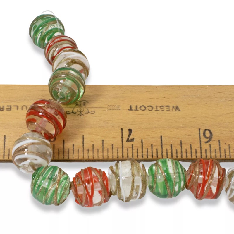 Hackberry Creek Set of 12 Christmas Lampwork Beads, Red, Green, White Swirl, 12mm Round