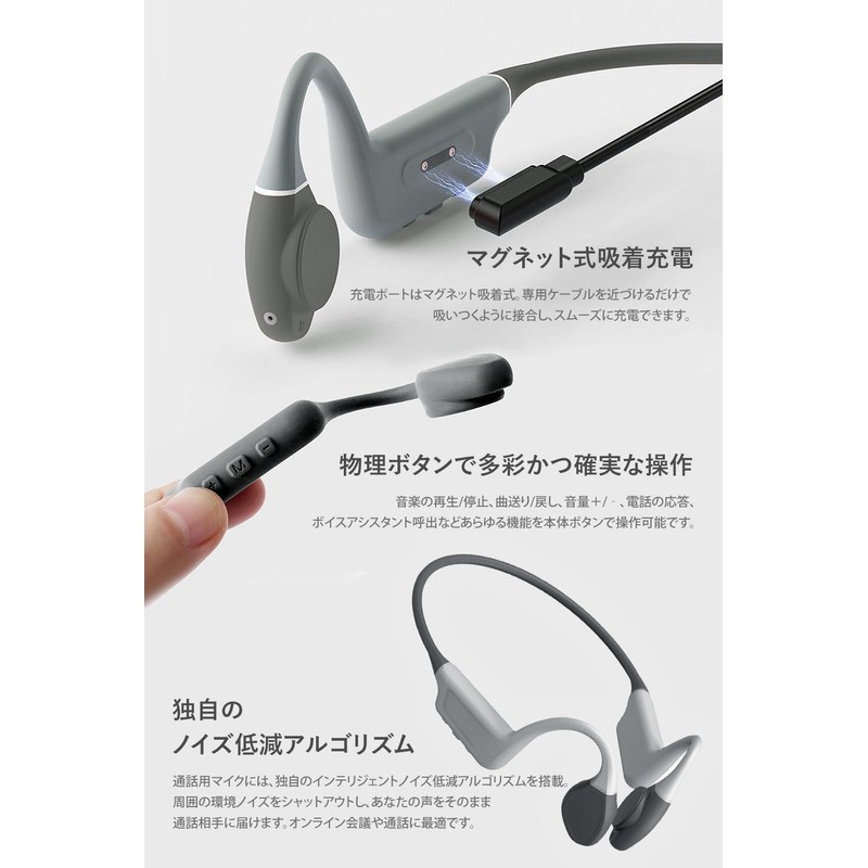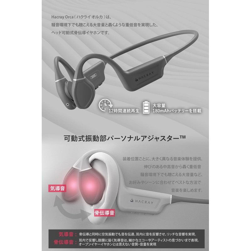Hacray Orca HR25140GR Movable Bone Conduction Earphones, W Sound, Bone & Air, Loud Volume, Deep Bass Enhancement, Adjustable, Just Fit, Noise Reduction, Bluetooth 5.3, Microphone Included, Wireless, 2