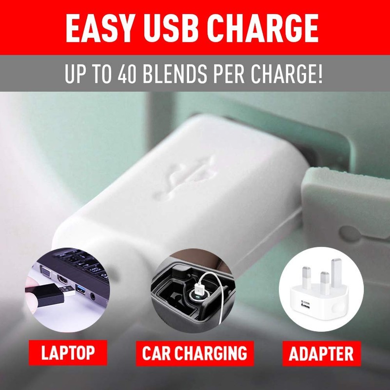 - USB Rechargeable: Forget about bulky chargers and finding an outlet. Our battery-operated blender recharges with a simple USB cable, providing up to 40 blends per charge for maximum convenience.
