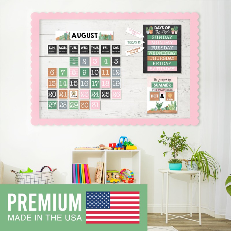 This calendar bundle includes everything needed to teach days of the week, months, weather, and more! Our calendar bulletin board sets for classrooms also capture kids' attention with their bright colors, so your students can learn (and retain!) new topics in record time. And unlike other calander bulletin board sets that are made overseas, our calendar chart for classroom/calendar for bulletin board set is USA made with thick cardstock, so these classroom bulletin board sets for teachers can be used year after year.