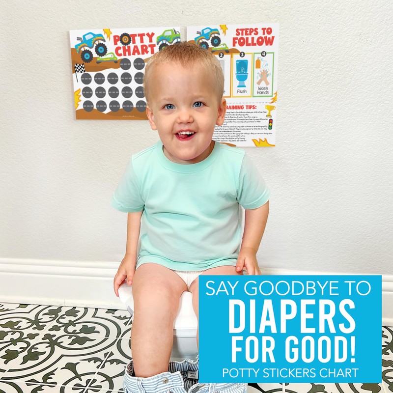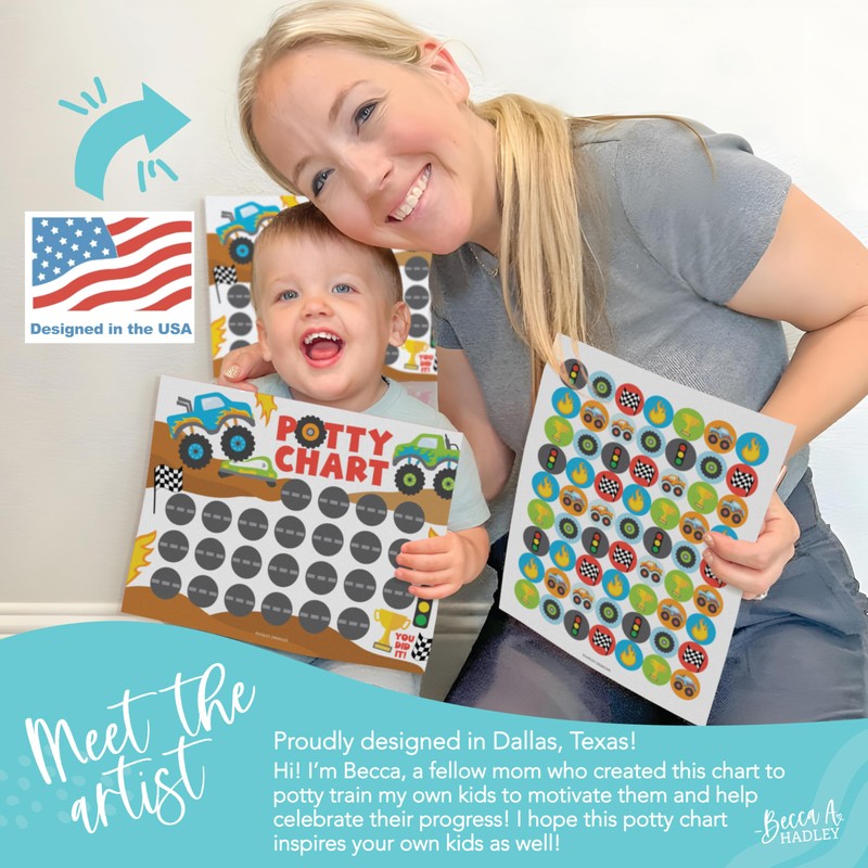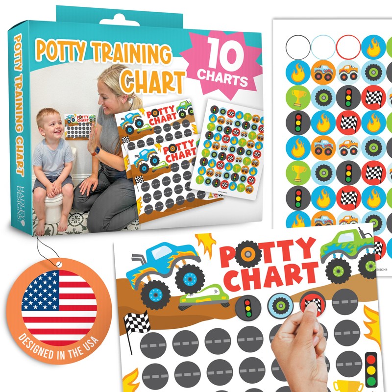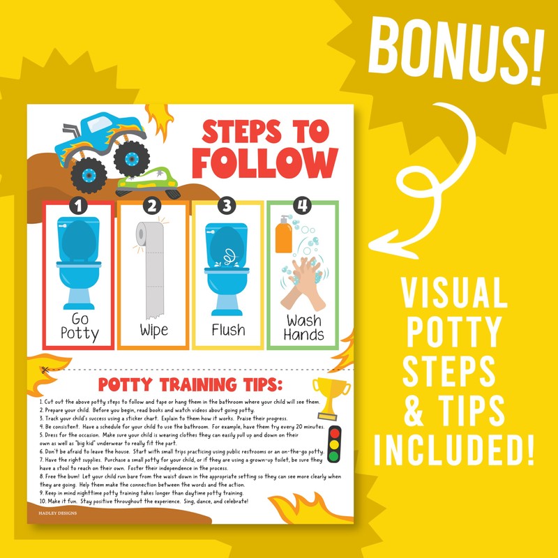 Hadley Designs Potty Training Chart for Toddlers Boys -10 Sticker Potty Chart for Toddlers Boys, 8.5x11" Potty Training Sticker Charts for Toilet Success, Monster Truck Toddler Reward Chart for Kids