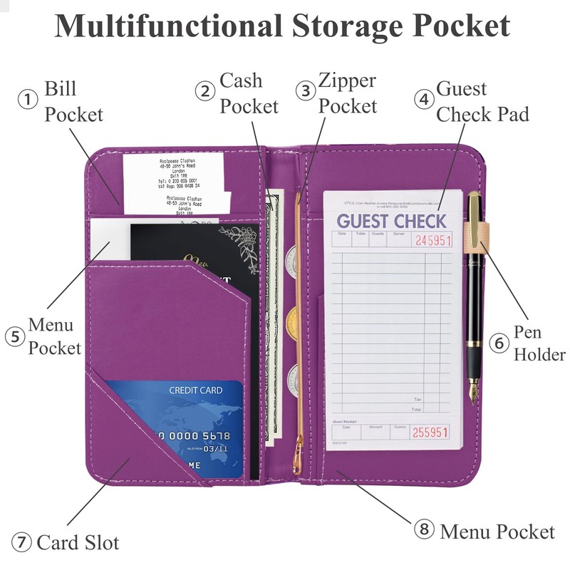 - Large Capacity: Multiple pockets and compartments to organize everything you need for your serving shift, including pen, guest check book, special menu, credit card, cash, checks, tips, bills, receipts, coins, and more.