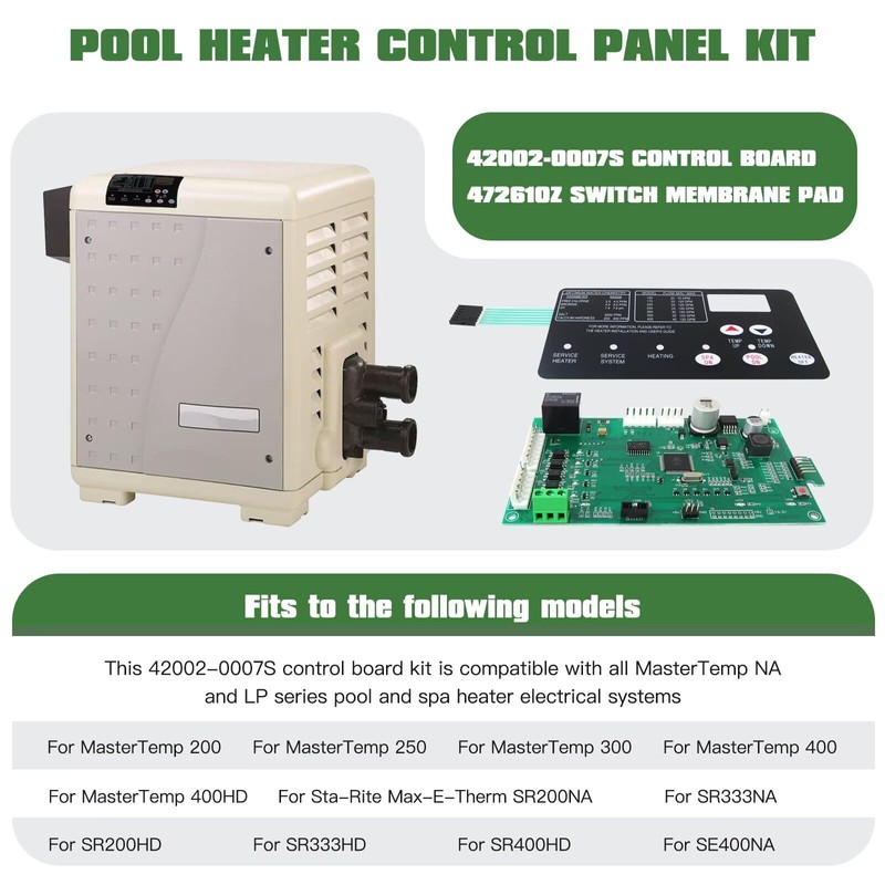 - 【Compatibility】 42002-0007S control board kit is compatible with Pentair MasterTemp NA and LP series pool and spa heater electrical systems. Compatible with MasterTemp 200 / 250 / 300 / 400 / 400HD control board, and compatible with Sta-Rite Max-E-Therm SR200NA / SR333NA / SE400NA / SR200HD / SR333HD / SR400HD control board.