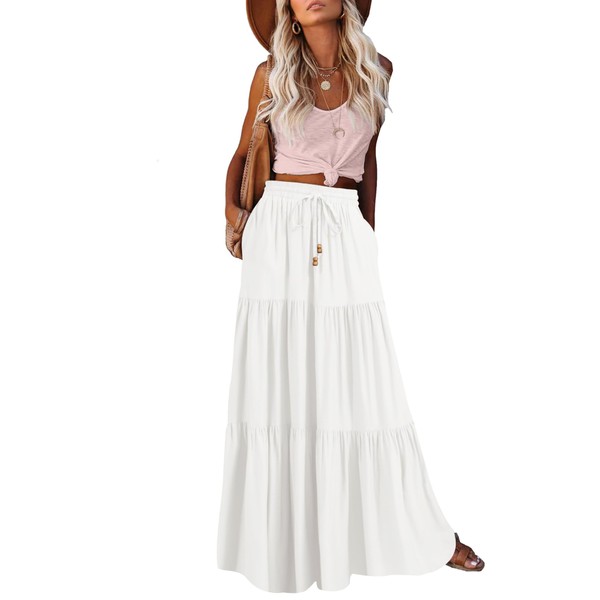HAEOF Women's Summer Boho Elastic High Waist Maxi Skirt A-Line Flowy Swing Ruffle Tiered Long Beach Skirts with Pockets(White, L)