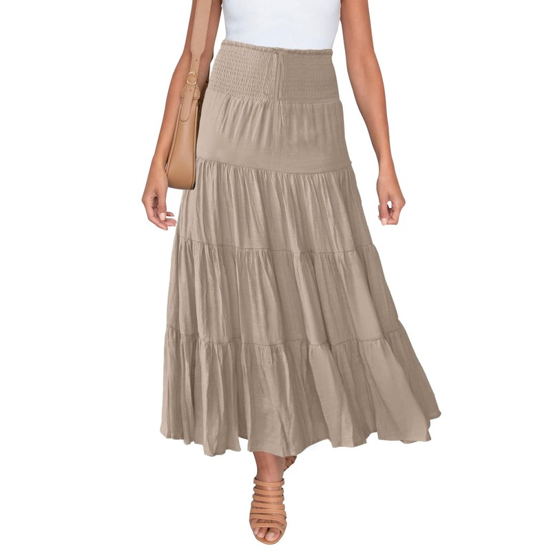 HAEOF Women's Summer Flowy Boho Maxi Skirt Casual Drawstring Elastic High Waist Pleated Tiered A Line Beach Long Skirts(Khaki, S)