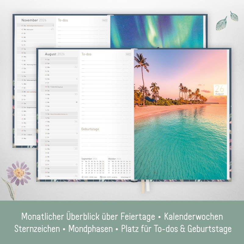 - Inspiring and thoughtful – with atmospheric images and helpful features such as holidays and school holidays for Germany and Austria, holiday trackers, monthly and year overviews, mood trackers, weekly plans, lists, note pages and more.