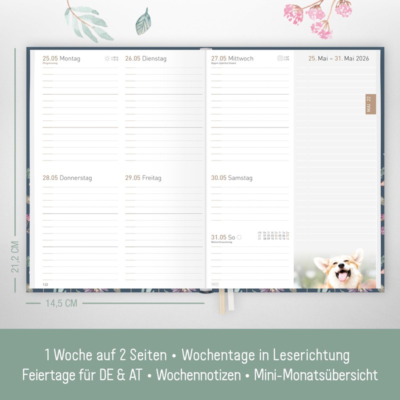 Practical functional pages in this 25/26 book calendar help you overcome everyday hurdles: generous note pages, holiday planning list, wash marks and clothing sizes, mood trackers, and much more.