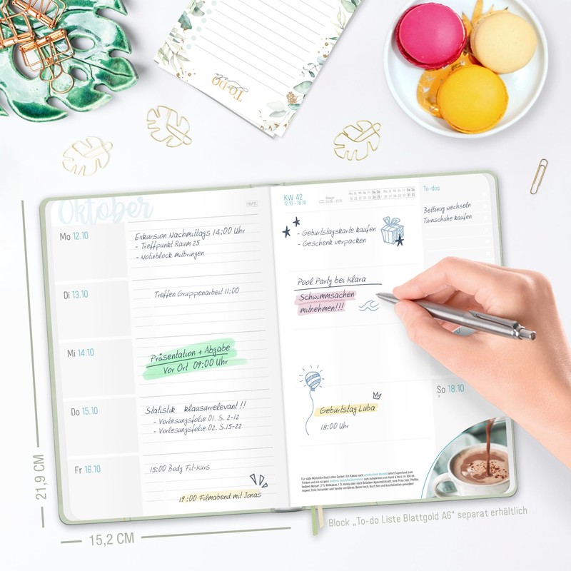 With helpful tips for time management, a clear weekly calendar including 14-day overview, useful information on holidays and holidays, monthly and year overviews and numerous planning aids such as lists and weekly plans, all appointments and to-dos can be overviewed and organised. No matter what happens suddenly or planned. And if you want to capture moods, secret wishes and zodiac matches or give in to a puzzle mood, you will find your personal writing and doodling place in the bucket list, in the mood tracker, love barometer, on Sudoku pages and on numerous note pages... after all, everything that happens in a year belongs together.