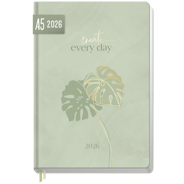 Häfft - Timer Book Calendar 2026 A5 "Green Monstera" January - December 2026, Hardcover Calendar, Diary A5 for Young Adults - Sustainable & Climate Friendly