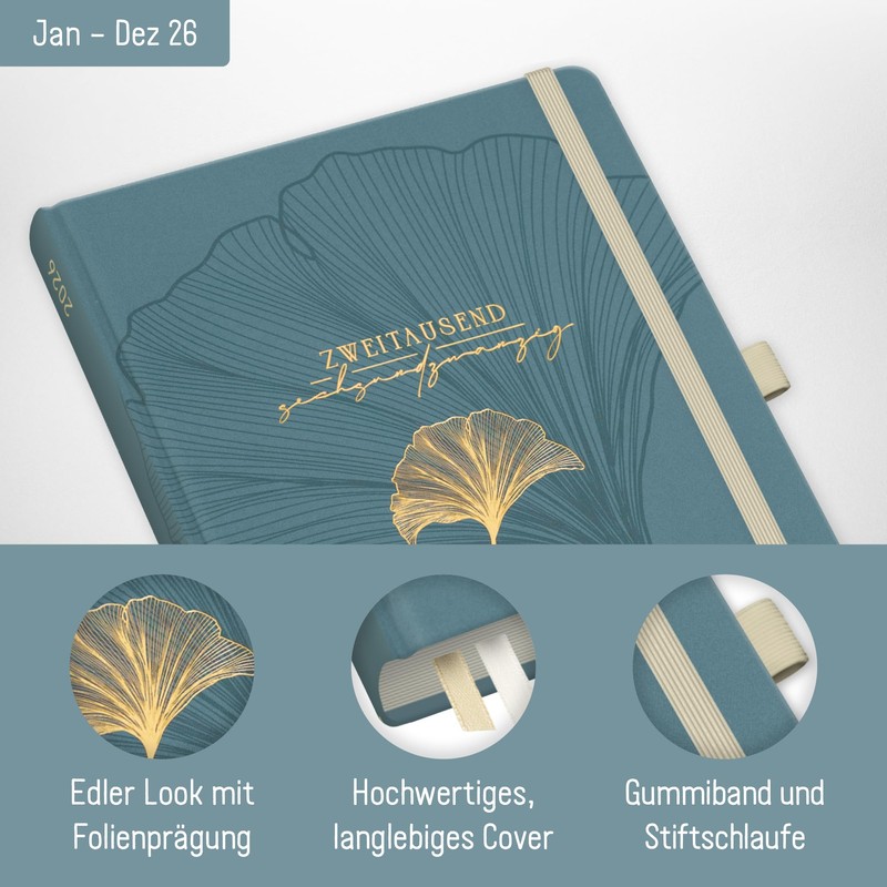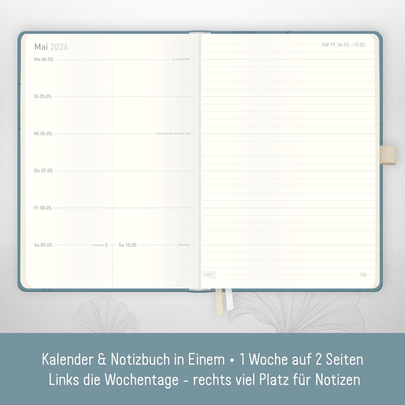 Häfft® Weekly Note Calendar 2026 A5 "Blue Ginkgo" Book Calendar, Planner Note Timer, Appointment Planner, Weekly Calendar, Organiser, Appointment Calendar with Pocket - Sustainable & Climate Friendly