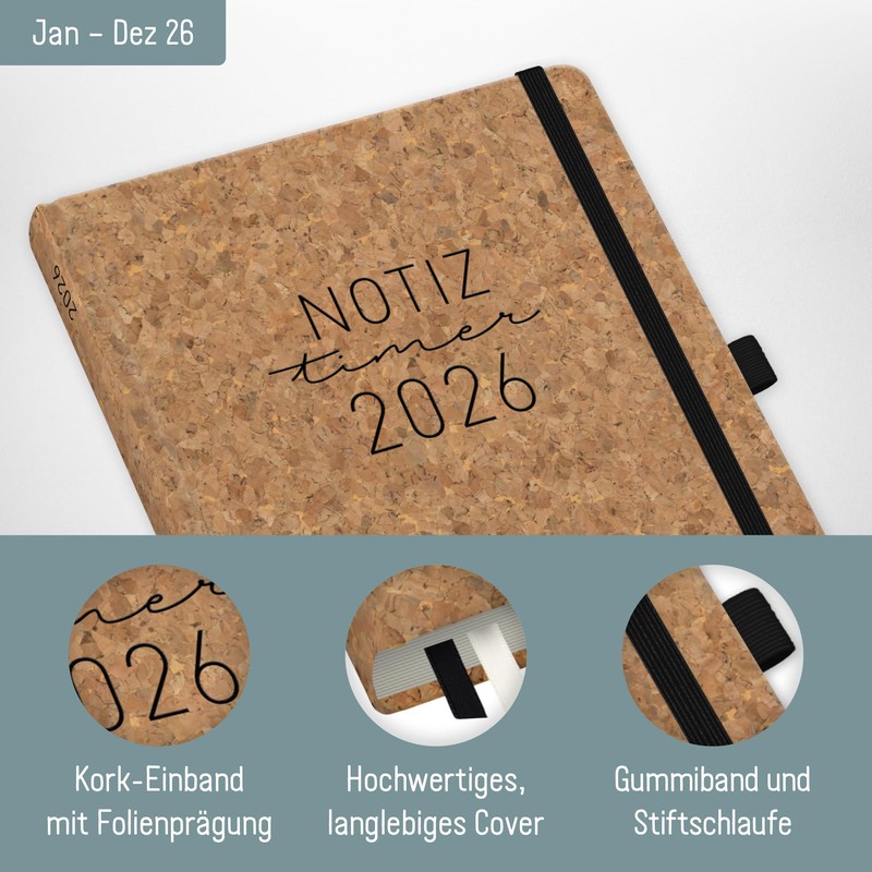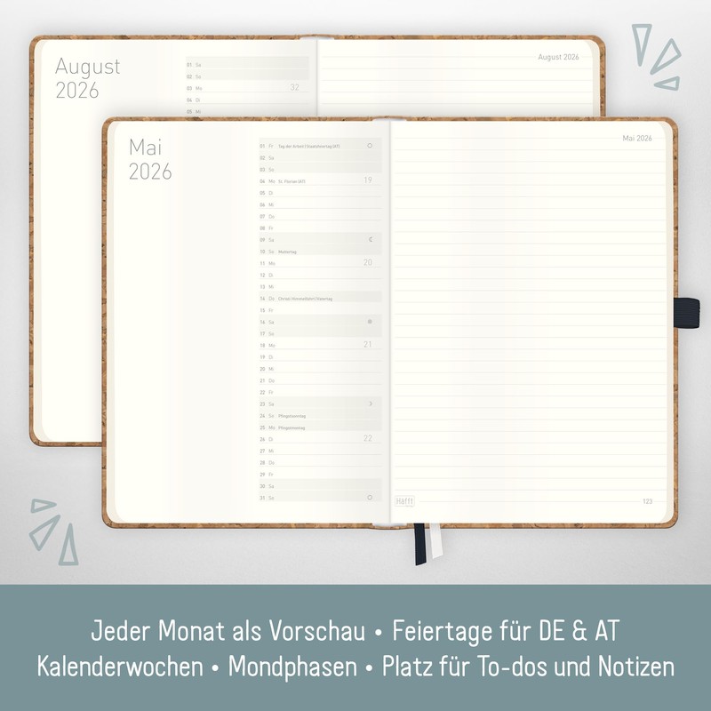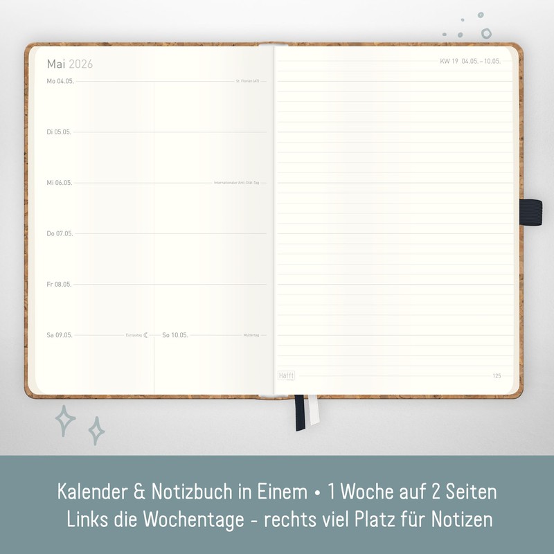 Häfft® Weekly Note Calendar 2026 A5 "Cork" Book Calendar, Planner Note Timer, Appointment Planner, Weekly Calendar, Organiser, Appointment Calendar with Pocket - Sustainable & Climate Friendly