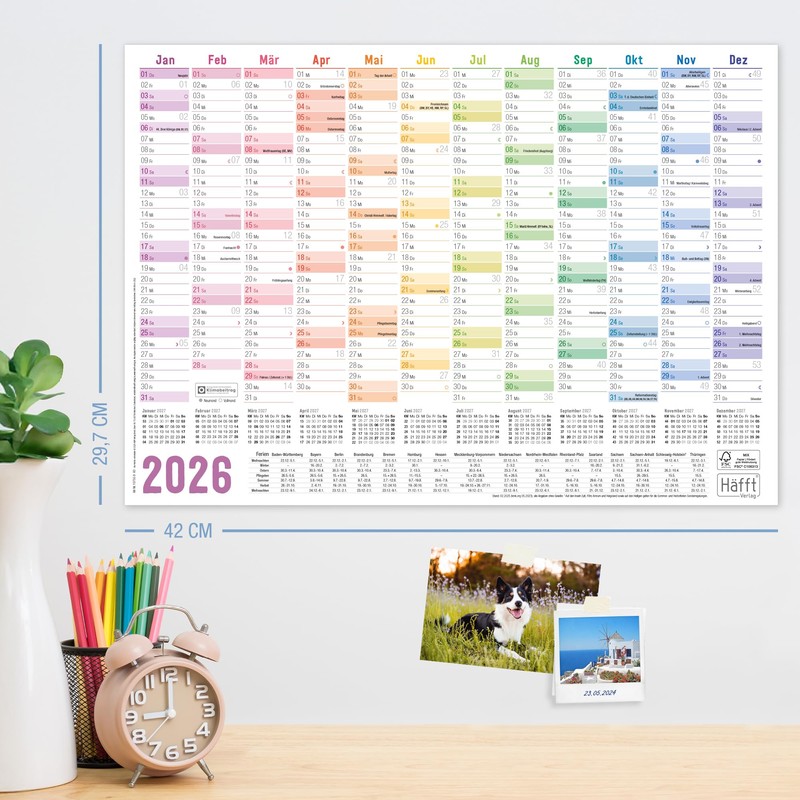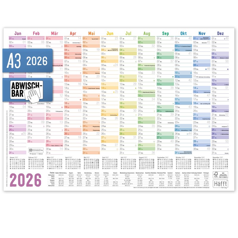 Häfft Wipe-Clean Wall Calendar 2026 A3 (42 × 29.7 cm) "Rainbow" Wall Planner with Holiday Overview and Holidays + Free A4 Calendar - Sustainable & Climate Friendly