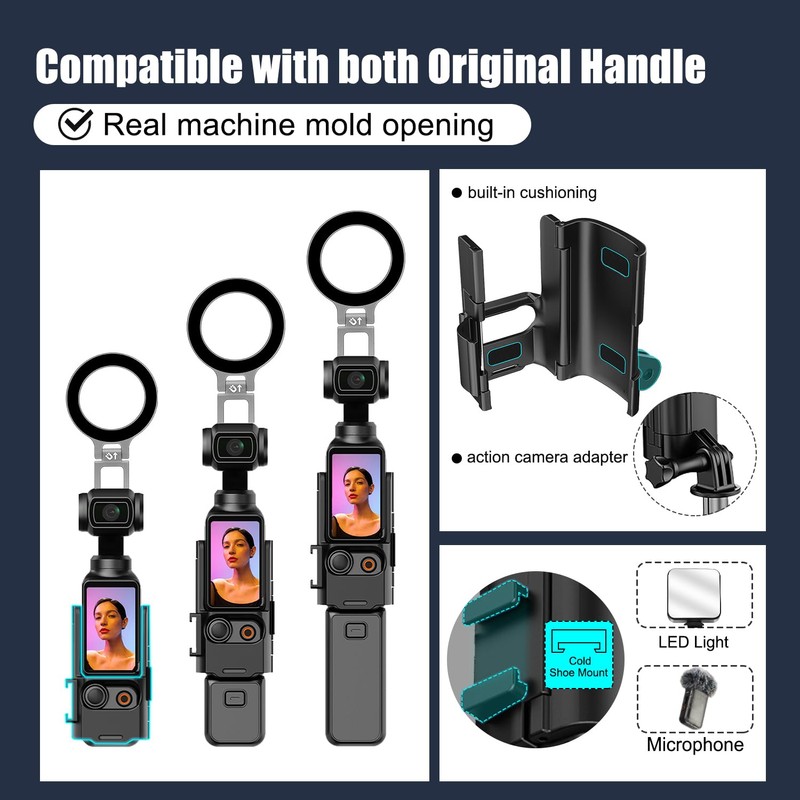 - Osmo Pocket 3 Expansion Adapter Frame-The frame is built-in soft rubber padding for secure grip and protection against scratches, precise cutouts for maintaining access to all button functions without obstruction.with cold shoe adapter to support video microphones, fill lights, and other accessories. With action camera adapter on the back, can fit well with action tripod