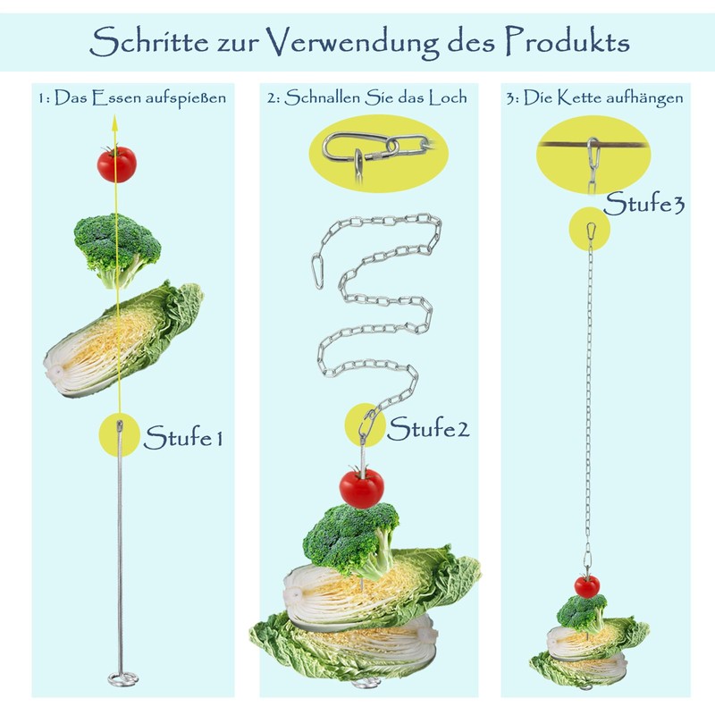 - Ideal size: The length of the fork of each feeder chicken is 23.5 cm and is long enough to skewer apples, corn, frizzy salad, salad and other vegetables and fruits. The chain of each chicken feeder has an adjustable hanging length of up to 100 cm, so that the food can be easily kept away from the ground, it stays clean and the natural foraging of the chickens is stimulated