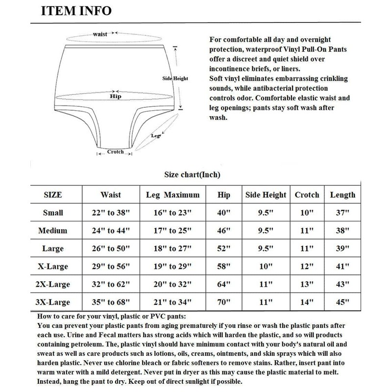 - Soft PVC eliminates embarrassing crinkling sounds, protection controls odor. Comfortable elastic waist and leg openings; pants stay soft wash after wash.