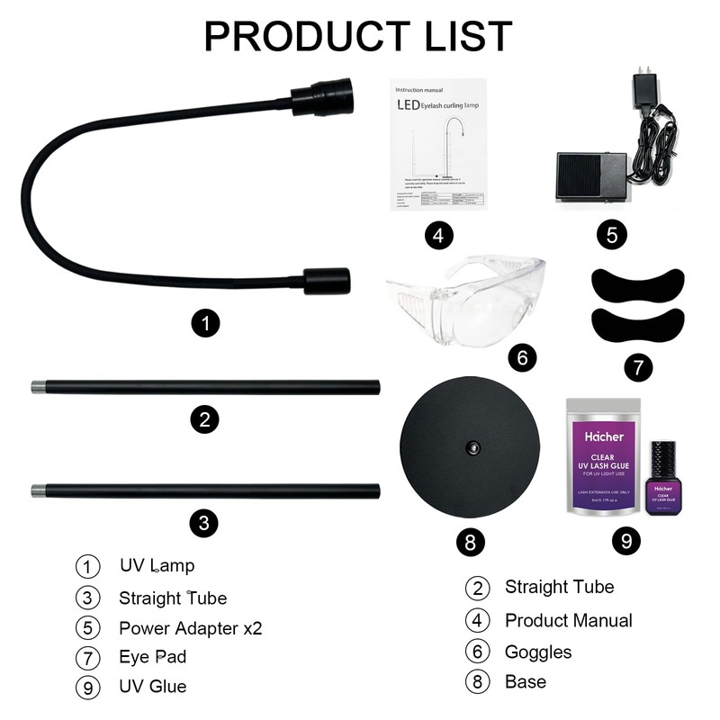 - 【Strong, Compact and Flexible】What's included, 1x UV Lash Lamp 5W black, 1x UV Glue, 1x Power Adapter, 2x Foot Pedal,1x Glasses, 1x Eye Pad. UV LED Power for the most durable eyelash you’ve ever had. Flexible adjustable gooseneck, latest LED technology, Light activation with foot pedal, High-quality, stable stand.