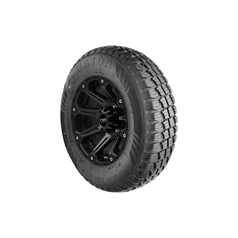 The Haida Puma HD818 is a mud terrain, all season tire manufactured for light trucks. The tire increases the off-road terrain traction, as the staggered tread blocks and high void ratio upgrade the soft, loose and uneven terrain traction. These tread elements allow the tire to eliminate mud, snow and rocks stuck between the tread elements, while resisting stone retention during the performance. The Puma HD818 increases the controllability as well by ensuring the surface contact throughout the drive, which ensures a better steering responsiveness and driving stability.