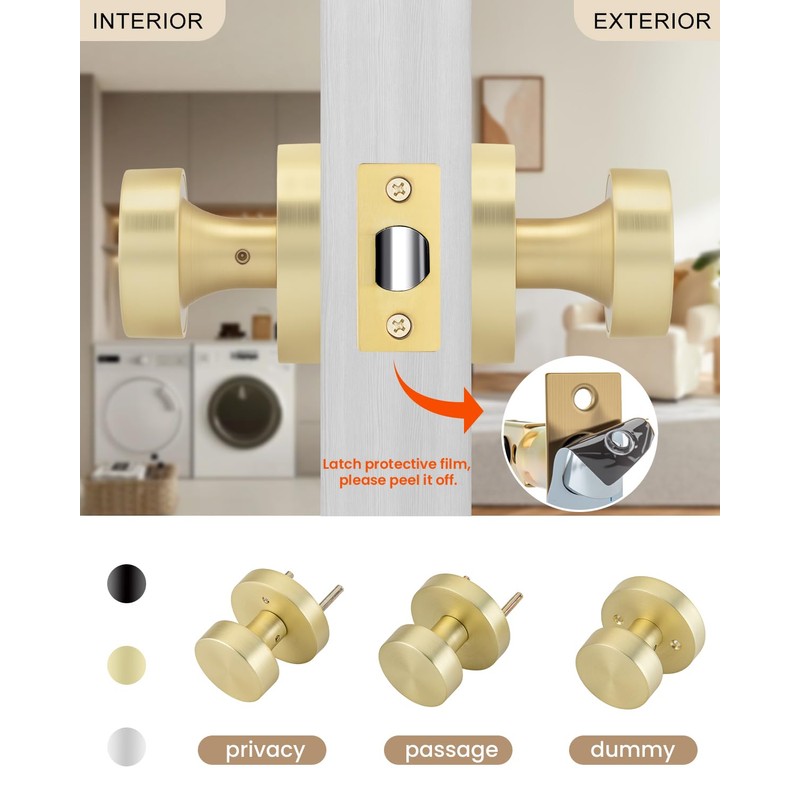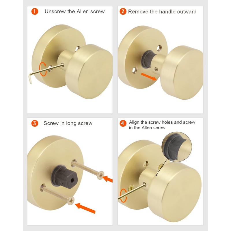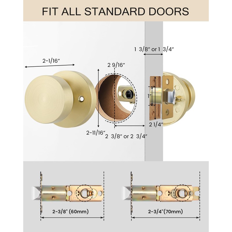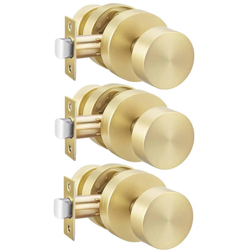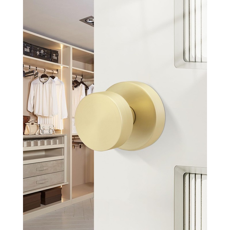 All knobs feature a sleek round design, a stylish brushed gold finish, and are made from durable zinc alloy. Easy to install and fits most standard interior doors.