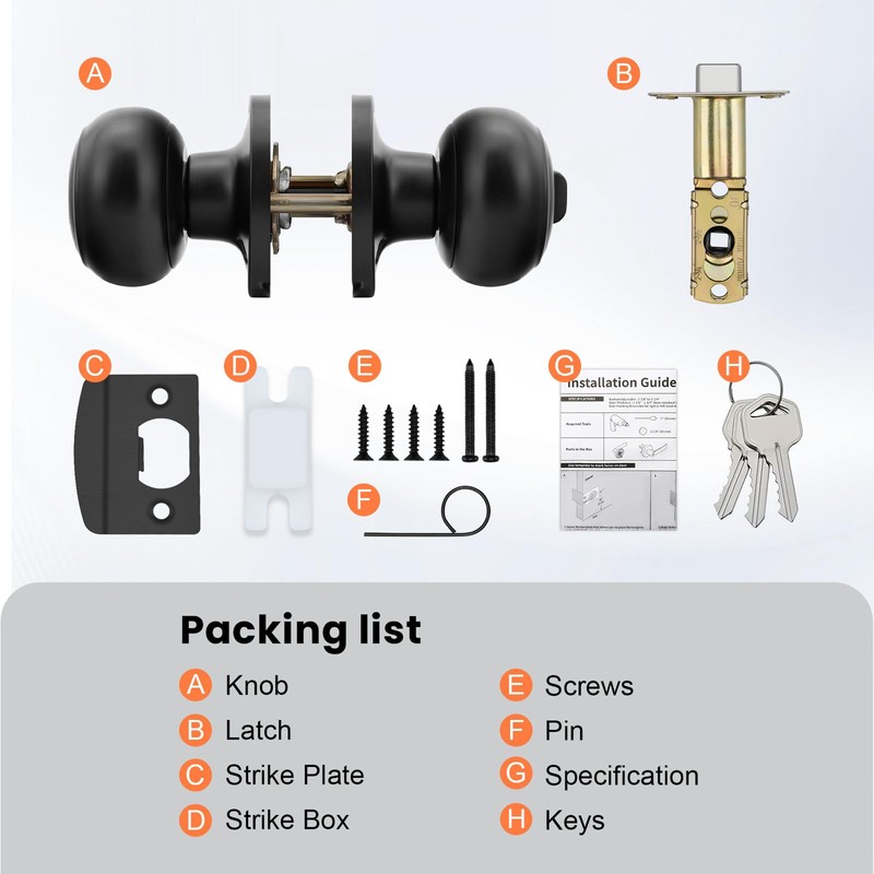 - Easy Installation --- Installs directly using the pre-drilled holes and requires only a screwdriver. Use the rotary button to lock from the inside and a similar key to unlock from the outside. Black Door Knob with Lock kit includes single door handle, strike plate, latch, installation guide and a few screws.
