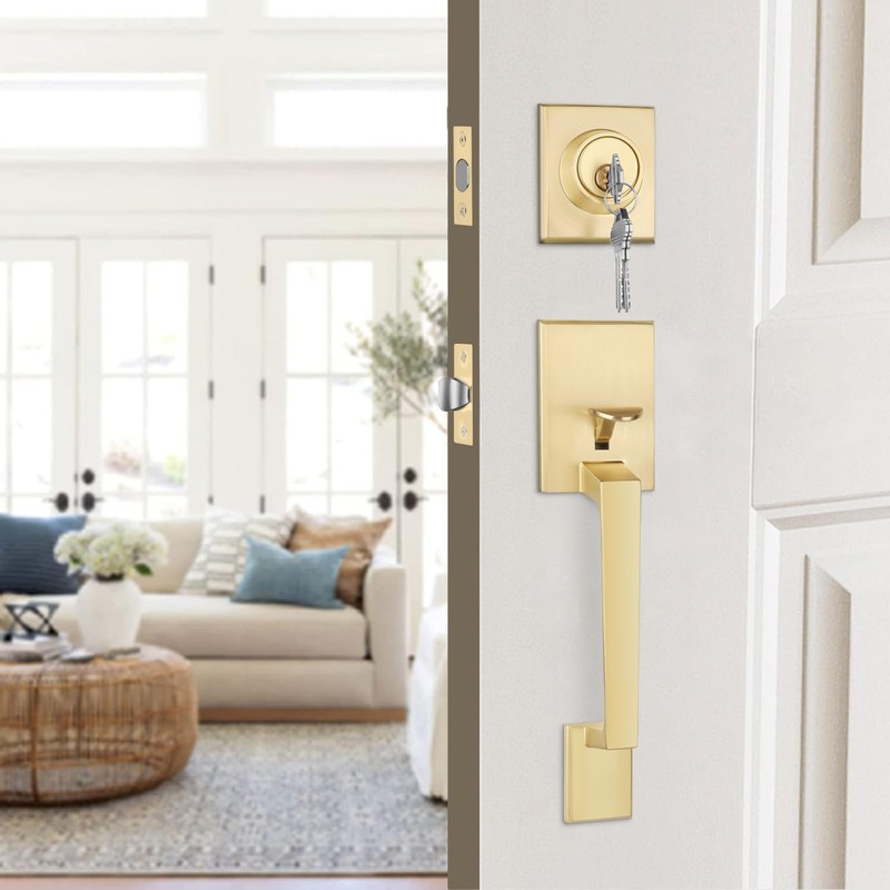 Haidms Gold Front Door Handle and Deadbolt Set, Entry Door Handle and Deadbolt Set with Reversible Handle Lever,Front Door Lock Set, Front Door Handles and Locks