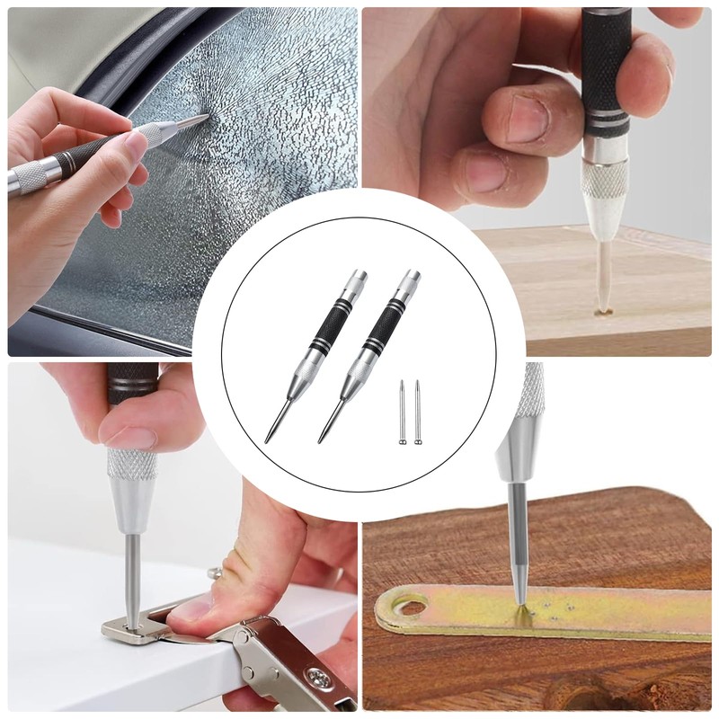 haierdidi Pack of 2 Automatic Centre Punch, Metal Automatic Centre Punch Tool, Automatic Window Breaker, Positioner for Metal, Steel, Wood, Glass, Non-Slip Handle with 2 Replacement Tips