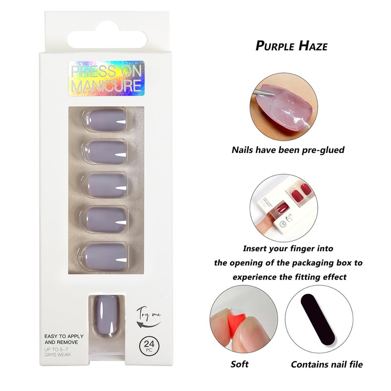 HAIIDOAK No Glue Press On Nails, Short Size, Squoval Shape, Self Adhesive, 24 Nails, Instructions Sheet, 1 Mini File (Purple Haze)