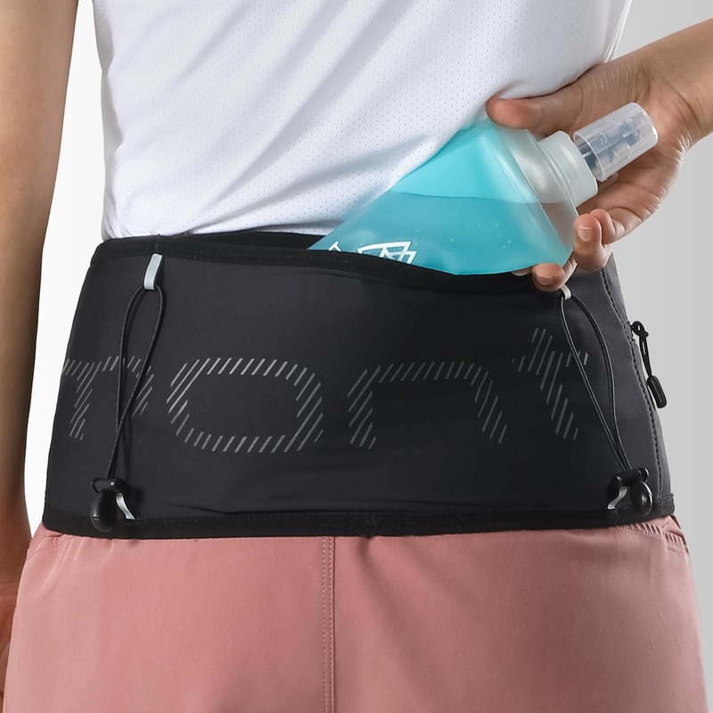 - Hydration-Ready Trail Running Belt Ultralight waist pack folds to 4x3in with 3 sizes (Men's: S: 30.5"-33", M: 33"-35", L: 35"-38", Women's: S: 29"-31", M: 31 "-33", L: 33"-36”). Instant hydration access via a 500ml flask slot (sold separately) - stay fueled mid-run without breaking stride. Compact design keeps essentials secure while prioritizing quick, one-handed water access