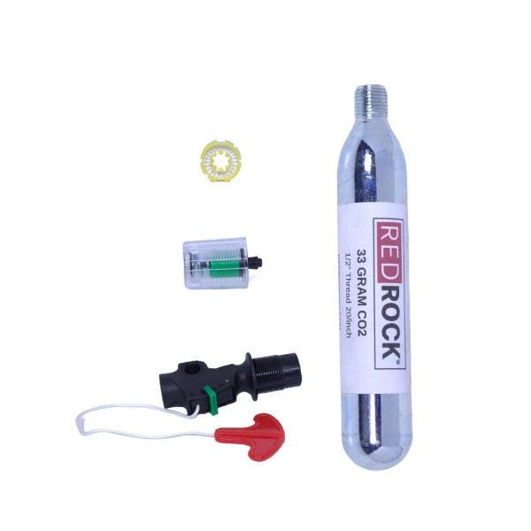 Include:1 X 33Gram 1/2" Threaded Co2 cartridge, 1 X Portable automatic inflator device, 1 X Yellow water-soluble bobbin (forautomatic activation) ,1 X Green safety clasps Latest Design: The red and greenindicator covers let you know if the bobbin have been used Reliable: Embeddedsafety buckle to prevent accidental touch and ensure device operation Notice:When we don't have a green safety buckle, the device can still be used, butaccidental touch increases the probability of the device working at anytime Perfect Accessories: An excellent accessory for inflatable life vest. Lifevest can ensure your safety during water sports, boating, surfing, fishing,sailing, motorcycles