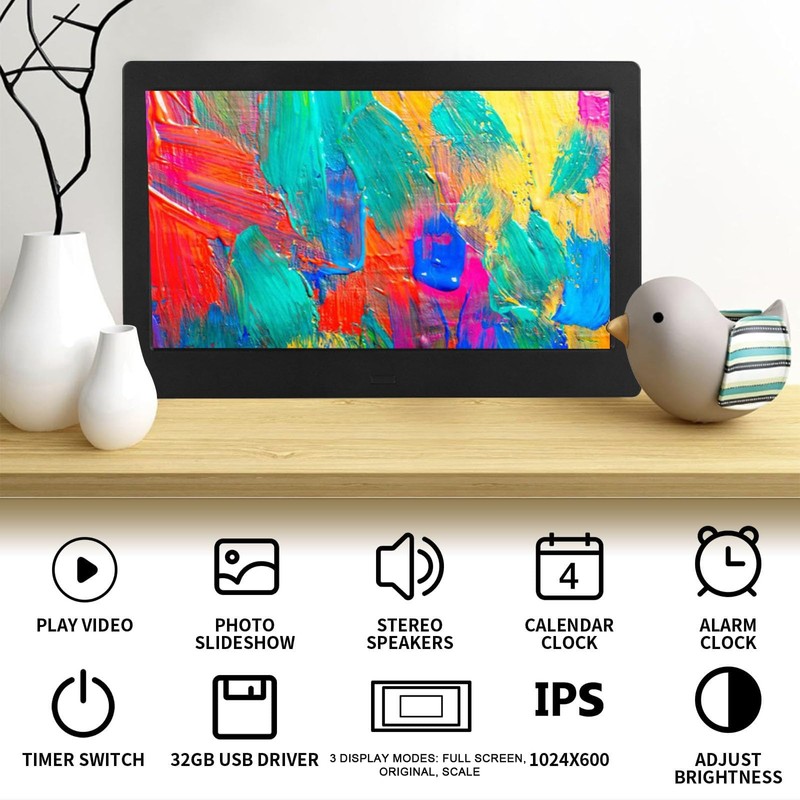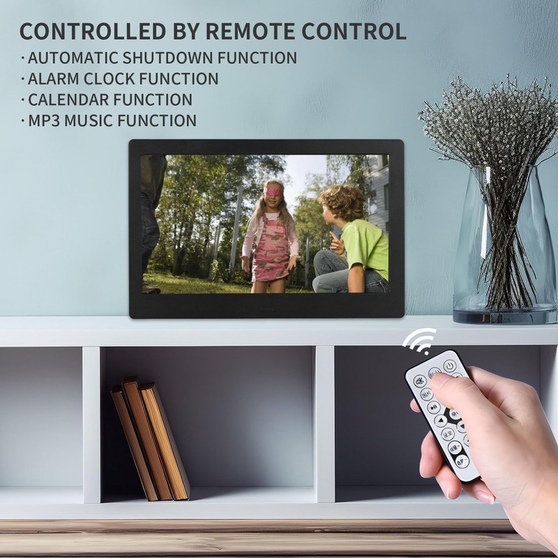 - Multi-Functional and Versatile: This digital frame goes beyond photos, supporting video, music, calendar, clock, and alarm functions. Its versatile design allows for both tabletop and wall mounting. Customize with features like auto power on/off and brightness adjustment.