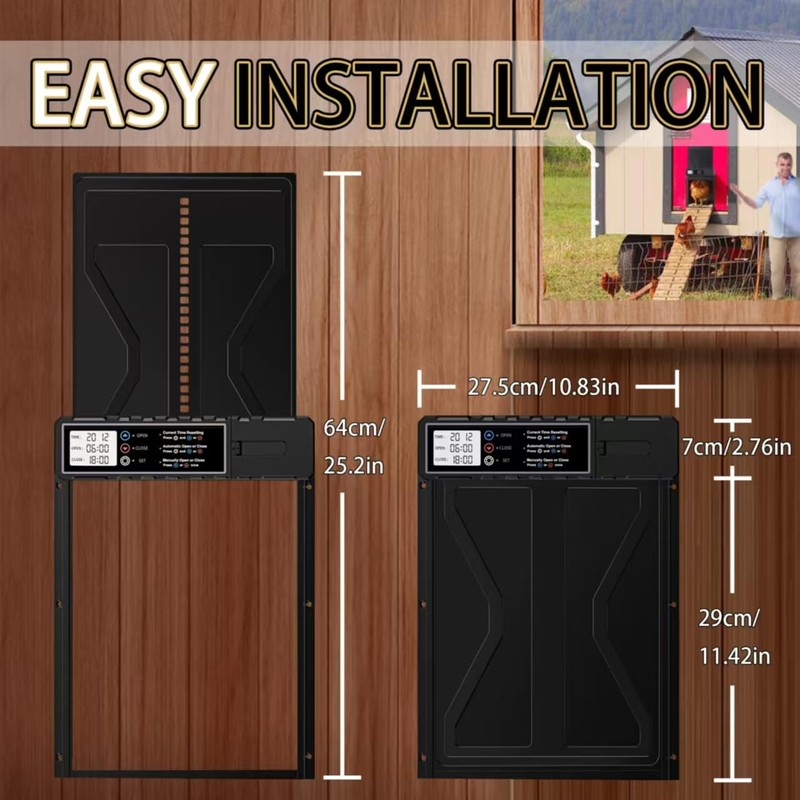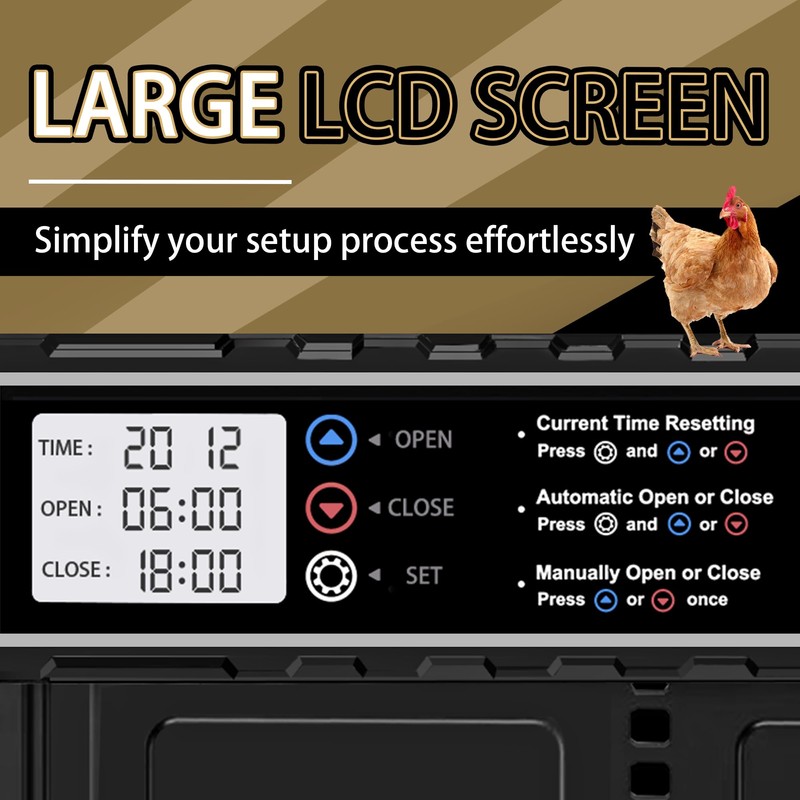 - Featuring an integrated LCD screen, our automatic chicken door allows for easy adjustment of opening and closing times. This user-friendly design ensures convenience and accuracy, eliminating any uncertainties in handling.