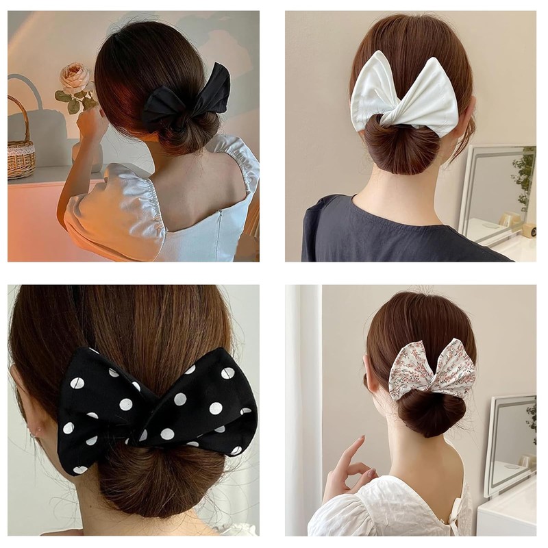 Hair Bun Roller Hair Band Set with Bow, 6 Pieces, Pattern - Polka Dot, Floral Pattern, Plain Colours in Black, Navy, Pink and White, Hair Styling Accessory
