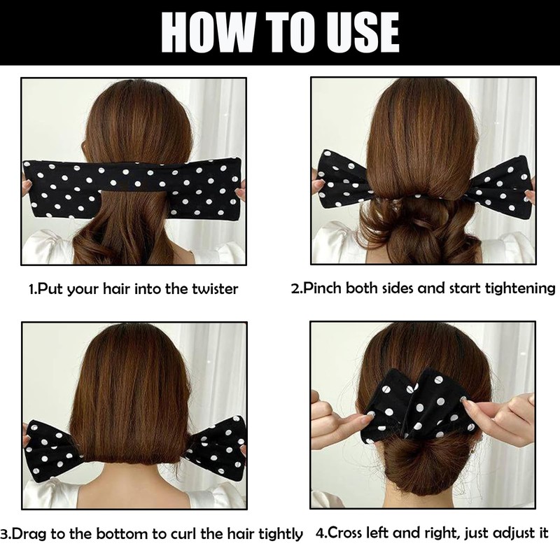 The practical hair bands allow you to quickly and easily style bun hairstyles in just four steps: insert hair into the ribbon, tighten both sides, pull down to curl and cross the ends.