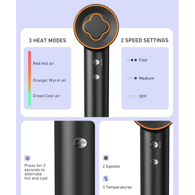 - Intelligent Temperature Control: Cosy Companions professional hairdryer measures the air temperature over 100 times per second and regulates the heat through a high performance chip control system. Avoid overheating damage to your hair and protect your hair. Our hair dryer has 3 different LED lights built in, and you can turn the LEDs into different colors by switching the heat button. Red means hot air, yellow is warm air and green is cool air. Enjoy blow-drying your hair in comfort!