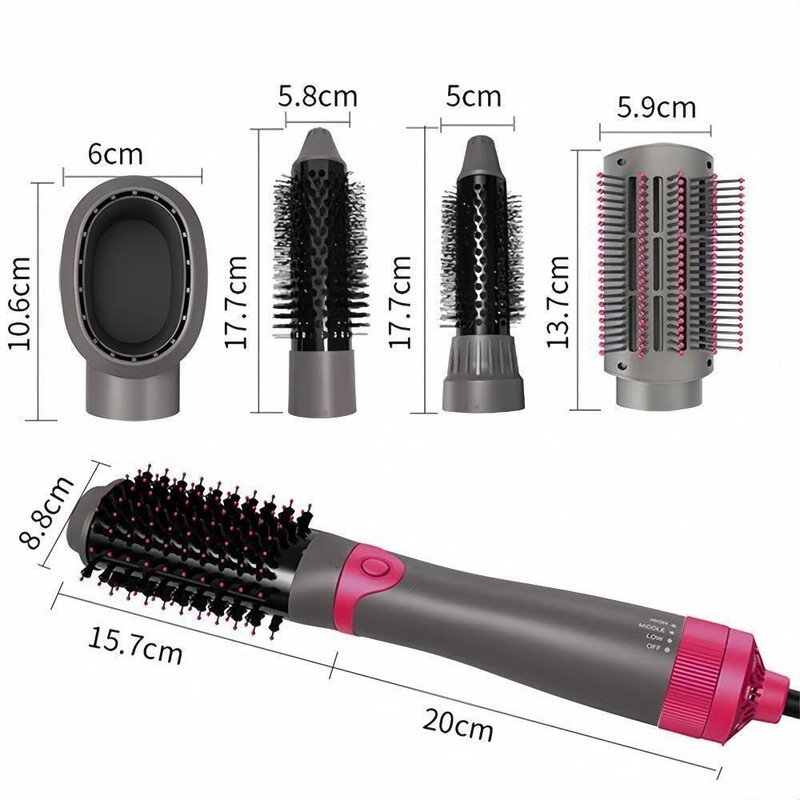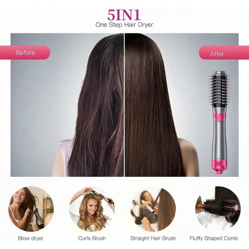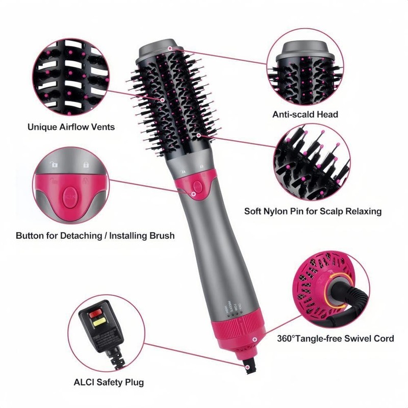 - 【Replaceable Brush Head Design】This 5 in 1 hot air brush set can meet all your different styling needs, including 1 hair dryer head for blow drying, 1 52mm styling brush head for straightening and volumizing, and 2 curling brush heads for curly styling. You can easily replace the brush heads with just the press of a button.(protected by patent USD0879374S)
