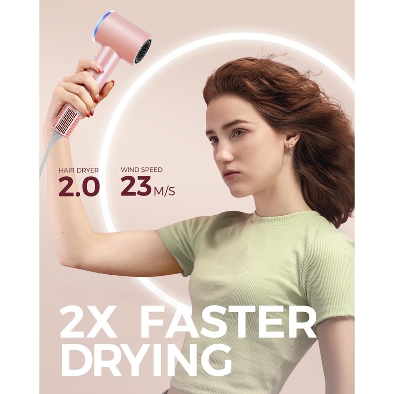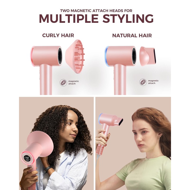 Goolioo Ionic Hair blow Dryer with Diffuser, Professional powerful Hair Dryer with High-Speed Drying and Quiet Operation - small hair dryer ionic with diffuser, Goolioo high-speed hair dryer features a powerful 110,000RPM brushless motor that provides a strong airflow up to 23 m/s, Resulting in ultra fast drying experience. Its compact design ensures comfortable use, Making it perfect for professionals and home users. with a low noise level, you can enjoy a peaceful styling experience, Making it perfect for early morning routines. HD digital screen with Adjustable Settings - with four heat settings (Cool/140℉/180℉/210℉) and three speed settings (Gentle/Medium/Fast), the Goolioo hair dryer allows you to customize your drying experience. HD digital screen makes it easy to adjust the settings to suit your hair type. 500 Times/s Thermo Control - The Goolioo blow dryer features dual smart Sensor that monitors the heat output 500 times/s to provide even and precise heat, Reducing the risk of hair damage from high heat, Two Magnetic Attachments for Versatile Styling - The Goolioo hair dryer comes with two attachments - a smoothing nozzle and an adjustable diffuser. to suit different drying needs, Making it ideal for curly hair Millions of Negative Ions for Silky Results and Reduced Frizz - The Goolioo hair dryer produces millions of negative ions during the drying process, Helping your hair stay silky without frizz, giving you a salon-quality finish every time