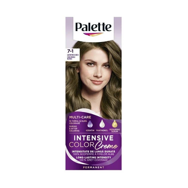 Hair dye PALETTE Intensive Color Creme 7-1 Cool Medium Blonde, long lasting intensity, 100% gray coverage, sparkling shine hair with a vibrant look 110ml x 2 (Pack of 2)