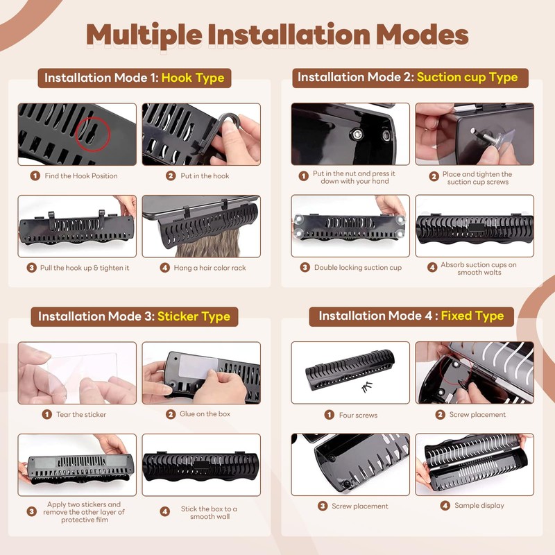 - 4 Installation Methods: The wig hanger offers 4 installation methods for different scenarios such as bathrooms, bedrooms, and offices. Suction cups are recommended for smooth tiles or mirrors, while screws are used for other walls. If you do not want to damage the wall, adhesive stickers can be used