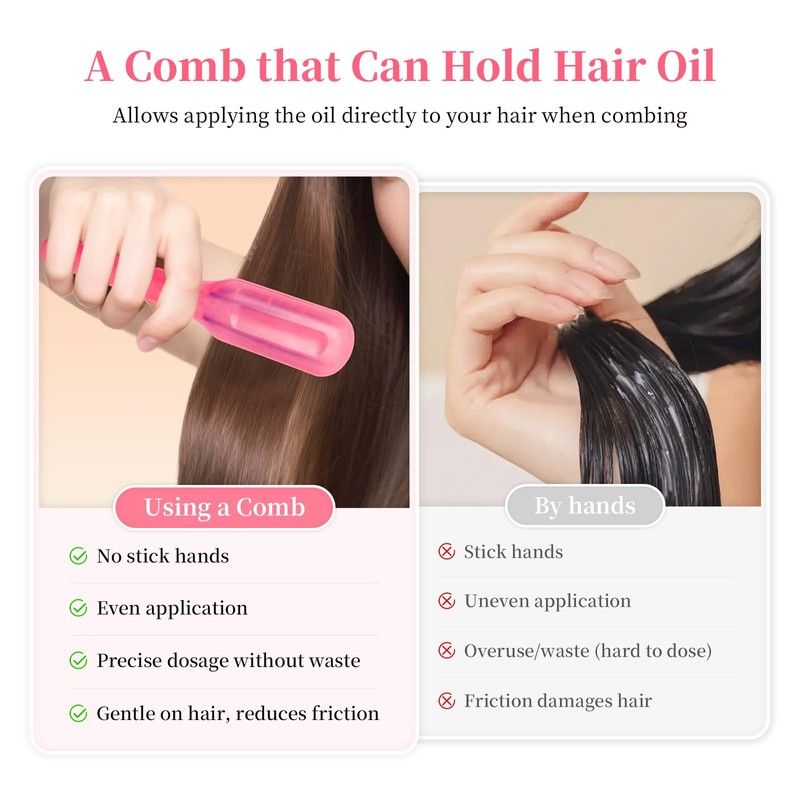 - Cut the "oiling your scalp" time down in half: The hair oil applicator comb with a handle oil dispenser, which automatically releases oil through the comb teeth when combing your hair for even and quick application, making hair oiling easier and avoid greasy hands and waste