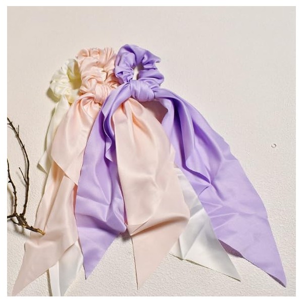 - Purple White Bow Hair Ties: These silk scrunchies for hair are perfect hair accessories for women girls, a nice substantial size that worked well to keep girls hair comfortably tidy, but also with satin to eliminate any hair breakage, light purple hair ties are so cute soft and don't pull at your scalp or give a headache, white scrunchie get a lot of compliments from work, elastics hair ties has pretty shades and very silk are definitely recommend