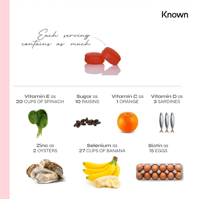 - ALWAYS TASTES GOOD. ALWAYS WORKS: Unlike other Hair, Skin and Nail supplements, Known’s Good to Glow Gummies are a delicious alternative to bulky and hard-to-swallow tablets and capsules, or strange-tasting powders. Each bottle of Known Gummies contains 60 delicious Vegan gummies (one months’ supply) that are free from artificial colours and flavours, just great tasting Strawberry flavour gummies formulated by healthcare professionals.