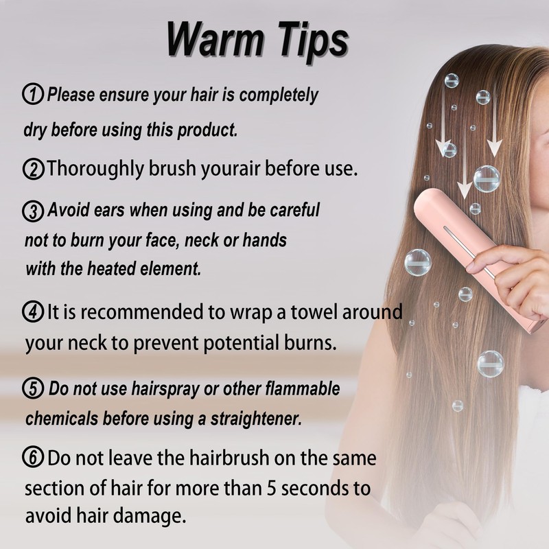 - 💈Caution: Please ensure your hair is completely dry before using this product. Do not use hairspray or other flammable chemicals before using a heated hair brush. Do not leave the hairbrush on the same section of hair for more than 5 seconds to avoid hair damage. This product should only be used on dry natural hair, not artificial or pet hair.